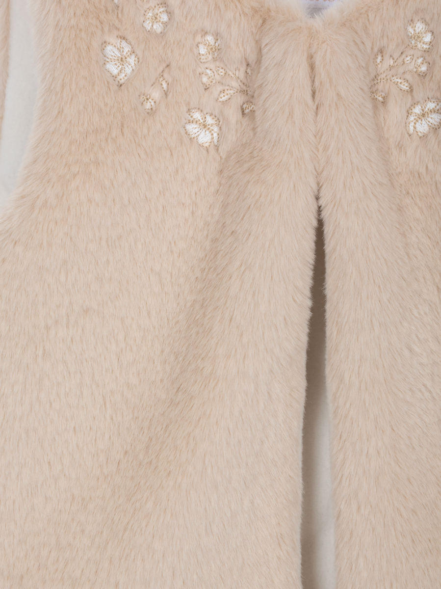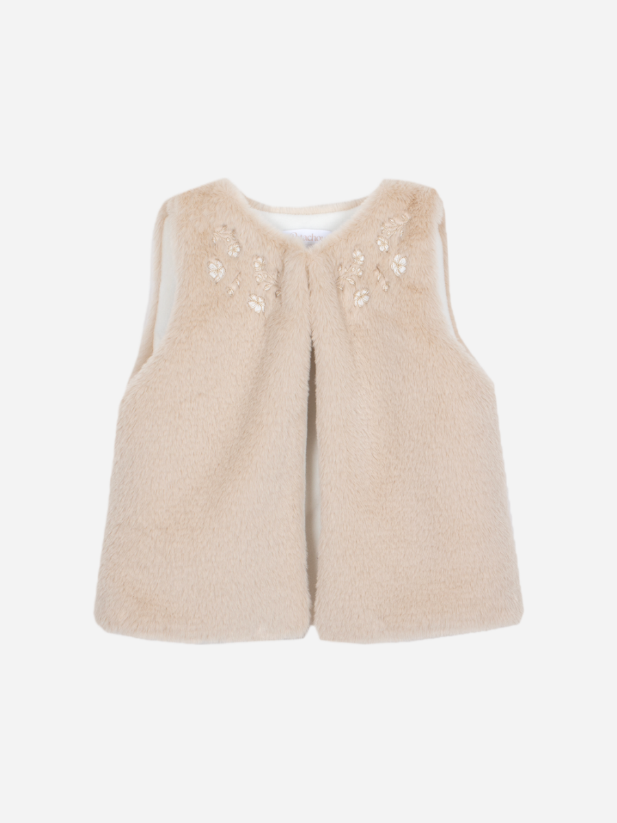 Stijlvolle beige vestje/bodywarmer met een zachte kraag bont en een dubbele. Warm en stijlvol voor je kleintje.