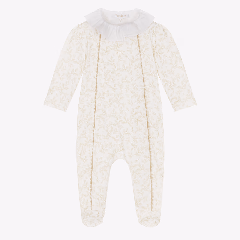 Ivoorwitte en beige Boxpakje voor meisjes van Patachou, gemaakt van zachte katoenen jersey. Deze schattige romper heeft een delicate botanische print en een klassieke rucheskraag. De romper heeft een asymmetrische drukknoopsluiting aan de voorkant, afgewerkt met mooie zigzagbandjes.