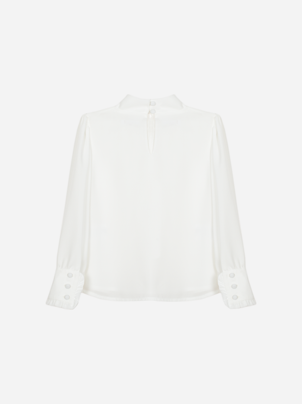 Deze elegante witte top met lange mouwen is gemaakt van lichtgewicht chiffon. Hij heeft een hoge halslijn met een rucherand en een grote, vloeiende strik.